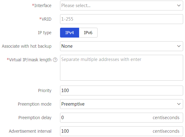 VRID | Enter a virtual router ID that uniquely identifies a VRRP group. VRRP groups sharing the same VRID on different devices indicate one VRRP group. |