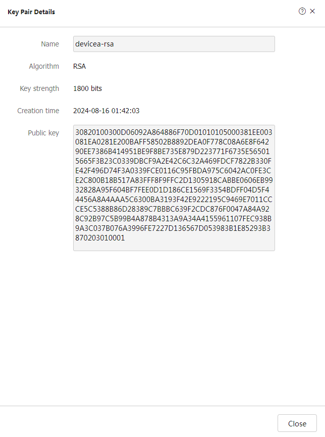 Create RSA key pairs on Device A and display the public keys of the RSA key pairs.