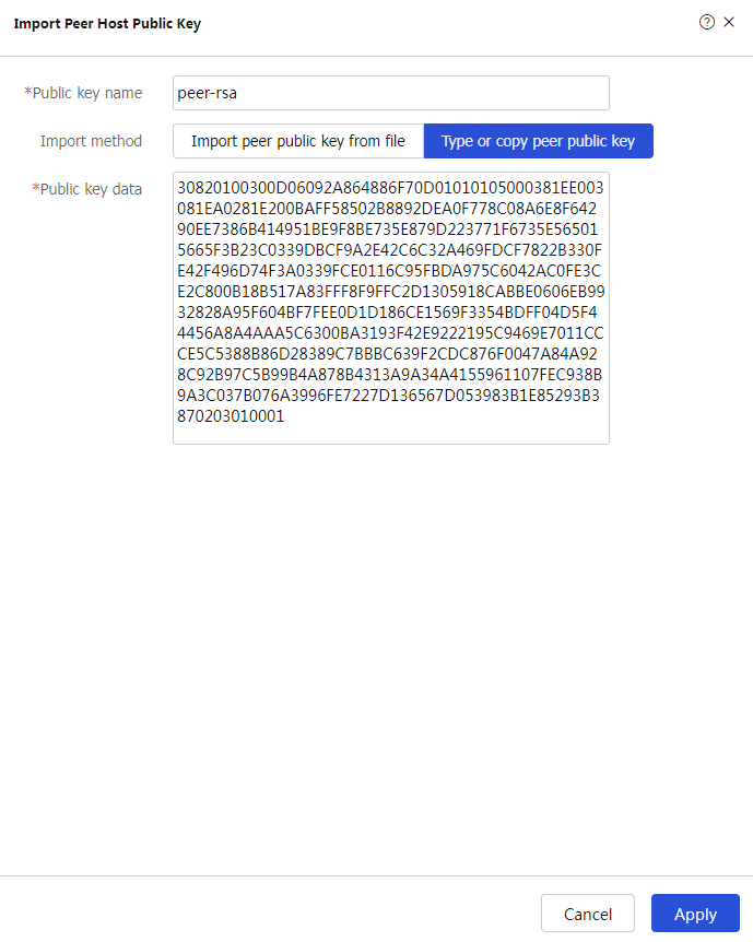 As a best practice, import rather than enter the peer host public key if you are not sure whether the device supports the format of the recorded peer host public key.