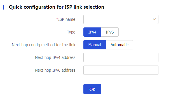 The ISP link selection configuration page fast generates outbound link load balancing configuration automatically by guiding you through the key configuration steps.