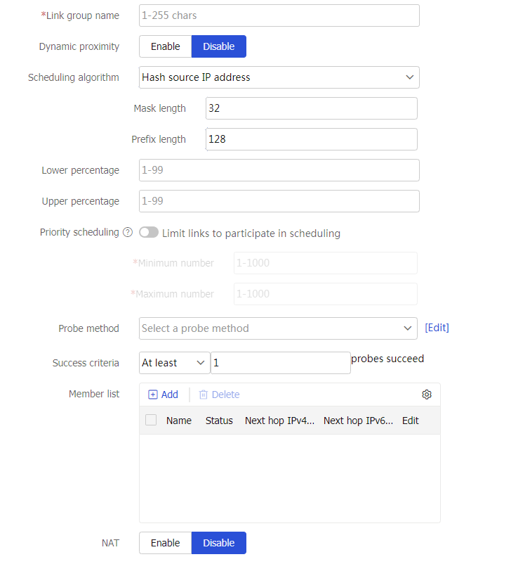 NAT | Enable or disable NAT. In outbound link load balancing, NAT typically needs to be disabled. |
