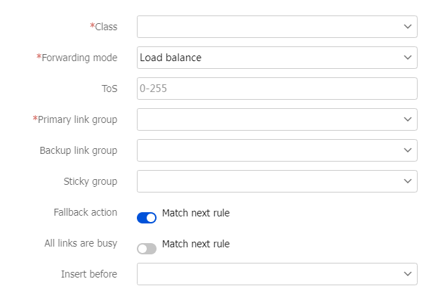 Busy action | Specify that the next rule is matched when all links are busy. |